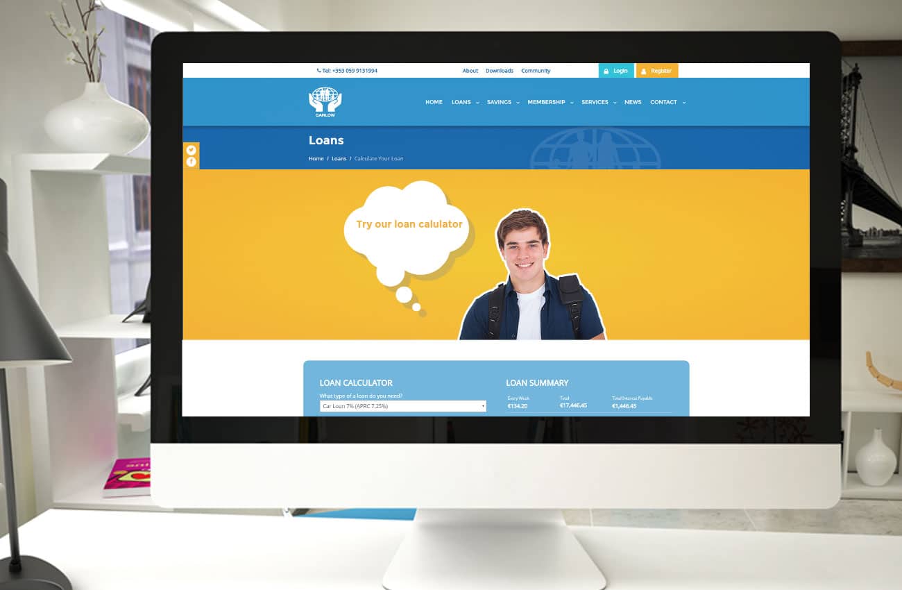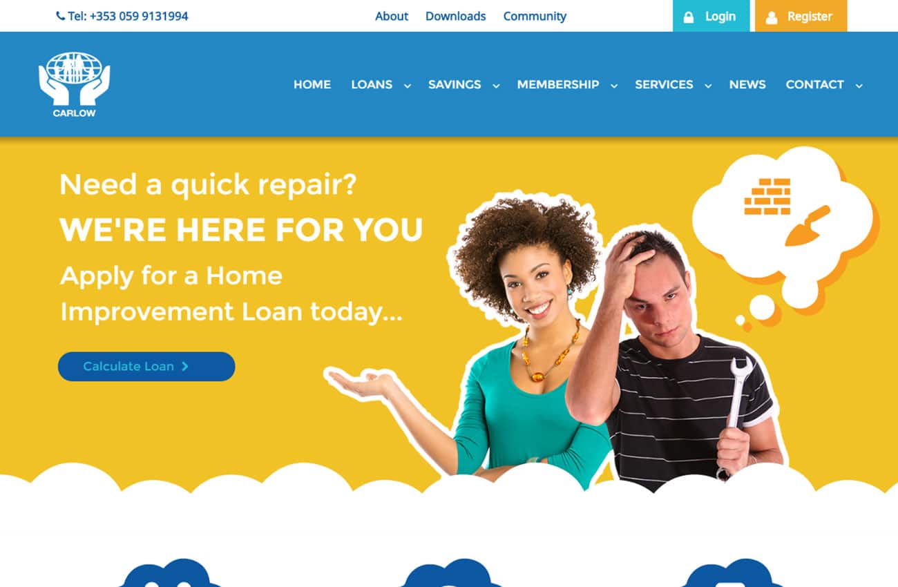 Key to this website is its logical flow and bright colours. All the information is in the right place at the right time. The home page has a slideshow of the key loan types, an overview of the key benefits, an interactive loan calculator, and most impressive of all, an aerial video of the local community. The overall effect is very warm and inviting.